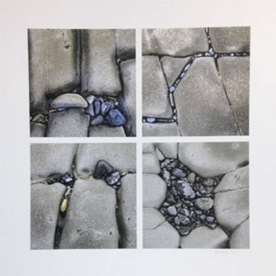 This year’s new work investigates STONE (a component of earth). As before, twelve artists were given identical formats and asked to interpret the theme in any way they wanted with any medium. The resulting work speaks for itself. The artists hope their work will create within you some thoughtful responses and questions. For insights, see inside this brochure. New this year is an interactive piece by Joan Neubauer. She encourages you to examine the book (very carefully) and look through the ideas and concepts she presents about stone.